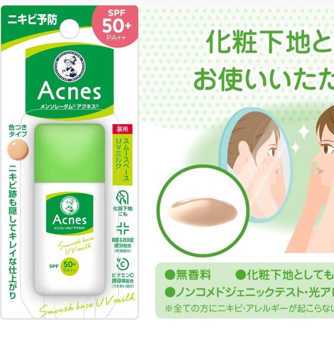 Лечебное УФ-молочко Acnes тщательно стерилизует кожу, склонную к размножению вызывающих прыщи бактерий из-за избытка кожного сала, и предотвращает появление прыщей. Кроме того, SPF50+, PA++ защищает кожу от сильных УФ-лучей, вызывающих акне. Он также впитывает излишки кожного сала, поэтому вам не придется беспокоиться о жирном блеске. Он также содержит производные витамина Е для предотвращения огрубения кожи.